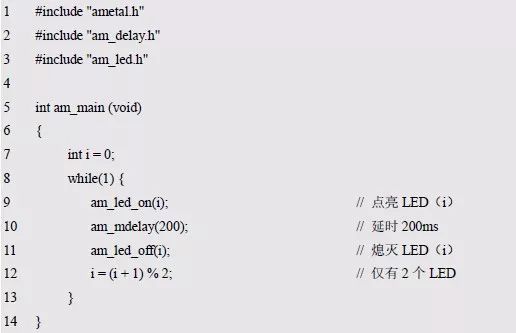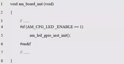 如果用戶不需要使用LED,為了節(jié)省內存空間,可以將工程配置文件(am_prj_config.h)中的AM_CFG_LED_ENABLE 宏值修改為0,裁掉LED 程序,該宏本質上控制了板級初始化函數中的一段程序,詳見程序清單7.8。