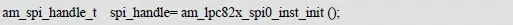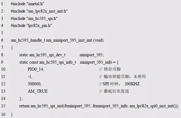 若使用LPC824 的SPI0 驅動HC595 輸出,則通過LPC82x 的SPI0 實例初始化函數am_lpc82x_spi0_inst_init()獲得SPI 句柄。即: