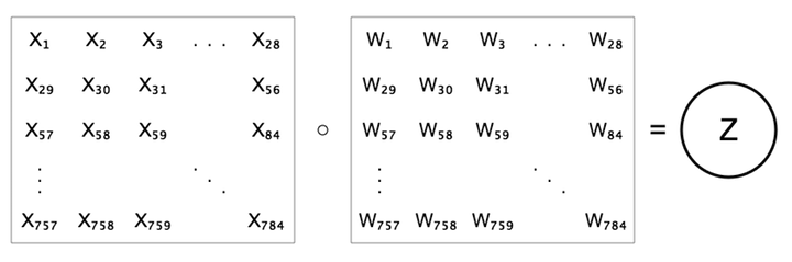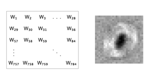 我們并不展開像素,而是將權(quán)重看成一個28x28的網(wǎng)格,其中權(quán)重的排列方式與對應(yīng)的像素完全一致。上圖右半部分和下圖看起來不同,但是它們都表達(dá)了相同的等式,即z = b + ∑ wx。