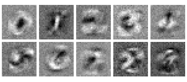 讓我們來看看所有10個輸出神經(jīng)元學(xué)習(xí)到的權(quán)重。 正如我們所猜測的那樣,它們都看起來像是10個數(shù)字有些模糊的版本,看起來好像是我們平均了許多屬于每個數(shù)字類別的圖像。