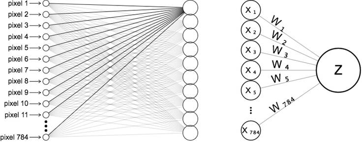 當(dāng)我們向神經(jīng)網(wǎng)絡(luò)輸入圖像時,我們通過將像素“展開”為一列神經(jīng)元來可視化網(wǎng)絡(luò),如下圖左半部分所示。讓我們集中注意力到第一個輸出神經(jīng)元的連接,我們將這個神經(jīng)元標(biāo)記為z,并將每個輸入神經(jīng)元和相應(yīng)的權(quán)重標(biāo)記為xi和wi。