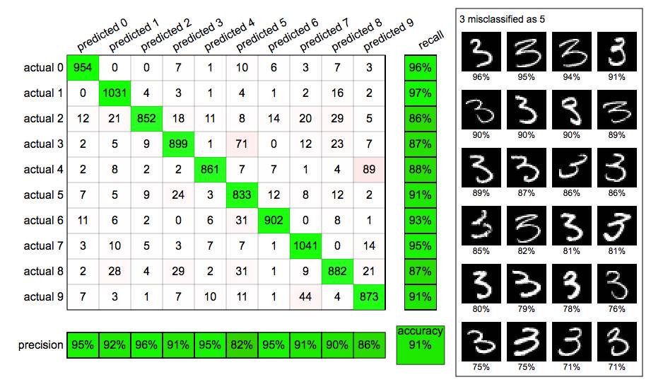 讓我們仔細(xì)看看上一篇的最后一個神經(jīng)網(wǎng)絡(luò)的性能,它在MNIST數(shù)字上達(dá)到了90%的精確度。達(dá)到這個精確度的其中一個方法是查找一個混淆矩陣,這個矩陣將我們的預(yù)測分解成一張表格。在下面的混淆矩陣中,行對應(yīng)MNIST數(shù)據(jù)集的實際標(biāo)簽,列對應(yīng)預(yù)測的標(biāo)簽。例如,第4行(actual 3)、第6列(predicted 5)的單元格表示有71個3被我們的神經(jīng)網(wǎng)絡(luò)誤標(biāo)記為5?;煜仃嚨木G色對角線表示預(yù)測正確的數(shù)量,而其他所有單元格均表示錯誤的數(shù)量。