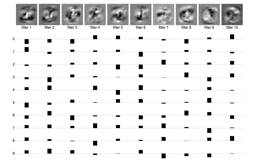 過濾器圖像下面的行對應(yīng)于我們的輸出神經(jīng)元,每行代表一個圖像類別。條形代表隱藏層傳遞給10個過濾器的激活對應(yīng)的權(quán)重。例如,0類似乎偏愛外緣的值較高的第一層過濾器(因為數(shù)字零傾向于如此)。它厭惡中間的像素的值較低的過濾器(通常對應(yīng)數(shù)字零中間的孔)。1類幾乎與此正相反,鐘愛在中間的值較高的過濾器,你可能已經(jīng)想到了,那里對應(yīng)數(shù)字1的豎筆。
