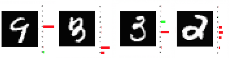 我們的單層MNIST網(wǎng)絡(luò)的一些錯誤。左邊兩個屬于可以理解的錯誤,右邊兩個則是明顯的錯誤