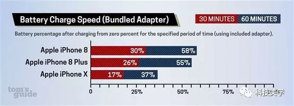 先看配備快充頭(幾款安卓均使用標(biāo)配)的表現(xiàn),iPhone 8/8P/X使用的29W USB-C適配器,當(dāng)然,還需要一根USB-C轉(zhuǎn)Lightning的線,結(jié)果如下——