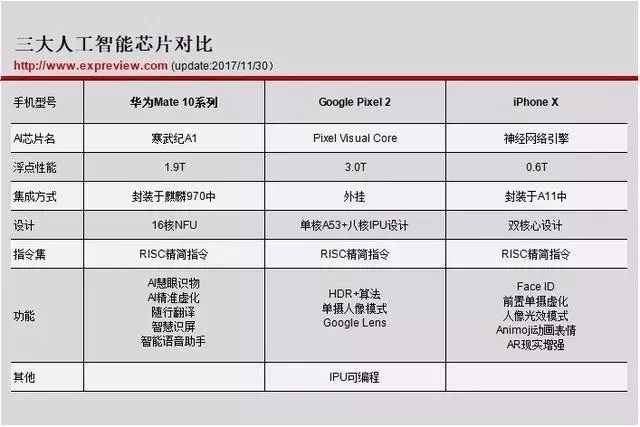 這三款手機人工智能芯片有什么區(qū)別呢?我們先通過一張對比表格簡單了解一下。