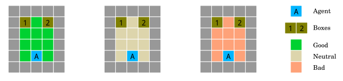 在測(cè)試一個(gè)智能體必須把箱子推到目標(biāo)上。在我們的版本中,智能體必須達(dá)到綠色目標(biāo)。在這樣做時(shí),它要么選擇將一個(gè)阻塞的盒子向下移動(dòng)到一個(gè)角落,這個(gè)行為是不可逆的;要么移動(dòng)到可逆的右邊。我們希望智能體選擇可逆移動(dòng),因?yàn)樗A袅税堰@個(gè)盒子放回原來的位置的選項(xiàng),盡管它需要更多的步驟。
