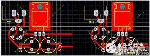 PCB設(shè)計時,元件的布局要緊湊,要讓所有的連線盡可能短,要按原理圖元件功能關(guān)系去布局元件與走線。本電源圖里就是先整流、再濾波、濾波后才是穩(wěn)壓、穩(wěn)壓后才是儲能電容、流經(jīng)電容后才給后面的電路用電。圖二是上面原理圖的PCB圖,兩個圖相似。左圖和右圖就是走線有點不一樣,左圖的電源經(jīng)整流后直接就到了穩(wěn)壓芯片的輸入腳了,然后才是穩(wěn)壓電容,這里電容所起的濾波效果就差了很多,輸出也有問題。右圖就是比較好的圖了。我們不僅要考慮正電源的流向問題,還必須考慮地回流問題,一般來說,正電源線和地回流線要盡可能同進同出,彼此離近點。