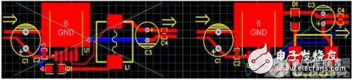 開關(guān)電源PCB設(shè)計時,需要注意的地方是:反饋線的引入點、續(xù)流二極管是給誰續(xù)流。從圖三可以看出,U1導(dǎo)通時,電流I2進入電感L1,電感的特性是電流在電感里流過時不能突然產(chǎn)生,也不能突然消失,電流在電感里的變化時有一個時間過程的。在脈沖電流I2流過電感的作用下,有部分電能轉(zhuǎn)換成磁能,電流逐漸增大,到一定時候,控制電路U1關(guān)斷了I2,由于電感的特性,電流不能突然消失,這時候二極管起作用了,它接替電流I2,所以叫續(xù)流二極管,可以看出,續(xù)流二極管是給電感用的,續(xù)流的電流I3是從C3的負端出發(fā),經(jīng)D1,L1后流入C3的正端,這里就相當于抽水機,利用電感的能量,把電容C3的電壓提高了。還有就是電壓檢測的反饋線引入點問題,應(yīng)該是經(jīng)過濾波后的地方反饋回去,不然會使輸出的電壓紋波更大。這兩點是我們很多PCB設(shè)計人員經(jīng)常忽視的地方,以為同一個網(wǎng)絡(luò),接在那兒不是一樣,其實接的地方不一樣,性能影響是很大的。圖四是LM2575開關(guān)電源PCB圖,大家看看錯的那幅圖是哪里錯了。