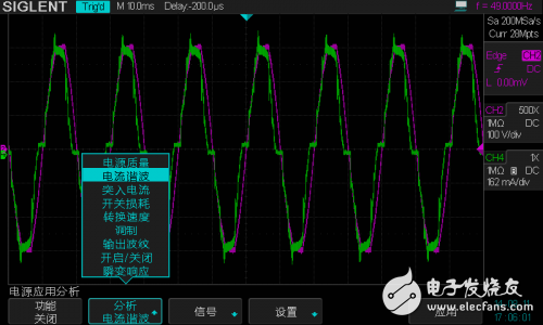 如上圖所示,SDS2000配備強大的電源分析模塊,在電源分析中可選擇電源質(zhì)量、電流諧波、突入電流、開關(guān)損耗、轉(zhuǎn)換速度、調(diào)制、輸出波紋、瞬變響應等多種不同的分析方法。這使得工程師們在實際應用中擁有更靈活的選擇、更大的操作空間。本文將重點介紹電源質(zhì)量分析、電流諧波分析以及突入電流的分析。