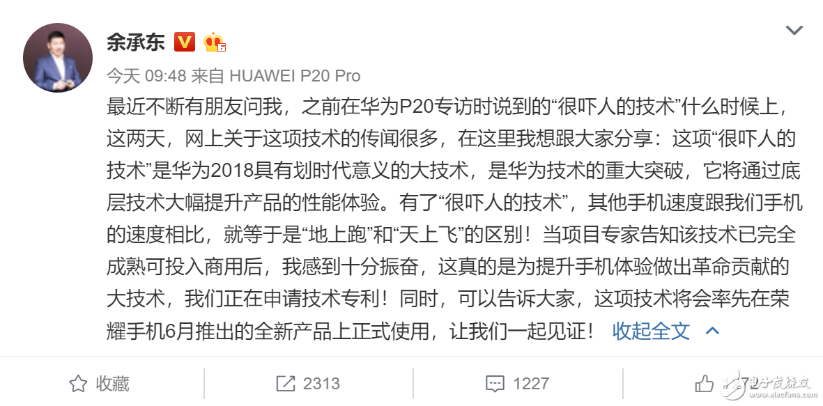 這項技術究竟是什么呢?就在今天上午,華為消費者 BG 總裁余承東在自己的微博上進行了“官宣”。