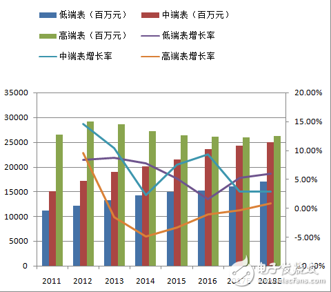 從銷量走向來(lái)看,高端表業(yè)從2012年開始變銷量便持續(xù)走低,不過(guò)自2015年后,又開始逐漸回暖。而中低端的手表在微微下挫之后,便迅速回彈,重新站穩(wěn),維持在一個(gè)程度,不再下跌??梢?jiàn)雖然智能可穿戴設(shè)備讓傳統(tǒng)手表受到了一定的影響,但是對(duì)于傳統(tǒng)手表而言,影響卻不是很大。