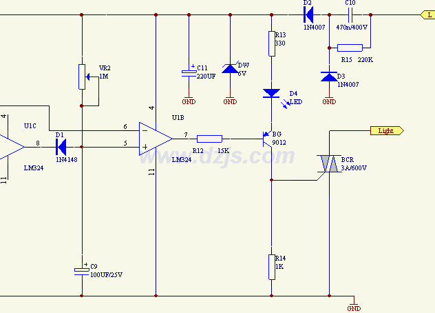 經(jīng)過(guò)了兩級(jí)放大的幅度已經(jīng)比較大了的交流信號(hào)送入到第三個(gè)運(yùn)放U1C組成的電壓比較器的反相端。運(yùn)放的同相端通過(guò)R10、R11分壓設(shè)置了約3.9V的參考電壓,此電壓還同時(shí)作為下一級(jí)U1D單穩(wěn)電路的觸發(fā)閾值電平。光敏電阻RG接在比較器運(yùn)放的(9)腳上,白一受光照,其阻值≤10kΩ,U1B輸出的交流信號(hào)的相對(duì)高電平經(jīng)R9、RG分壓后到U1C的反相端(9)腳的電平仍比其同相端低,U1C保持輸出高電平,D1反偏截止,U1D單穩(wěn)電路無(wú)觸發(fā)信號(hào)而輸出高電平,三極管BG保持截止,可控硅BCR門(mén)極得不到觸發(fā)電平而截止,燈不亮。