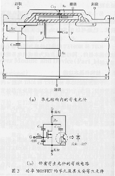 ????這些由MOSFET的物理結(jié)構(gòu)所決定的電容是其最重要的寄生參數(shù)。圖3表示了它們的起源和等效電路圖。表1解釋了圖3中各種寄生電容和電阻的起源和符號。