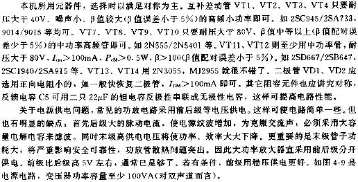 本功率放大器采用恒流二極管作差動(dòng)放大級(jí)的激勵(lì)級(jí)負(fù)載,并用達(dá)林頓復(fù)合管作全對(duì)稱互補(bǔ)輸出,具有電路簡(jiǎn)單