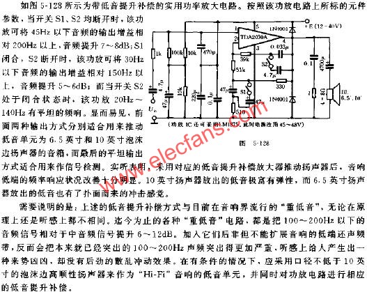迄今為止,幾乎所有的高保真功率放大器都被人們設計成為具有平坦的頻率響應特性曲線。然而,由于揚聲器的聲壓頻率,特性曲線并不是平坦的直線,采用上述頻率響應特性曲線完全平坦的功率放大器來推動揚聲器,并不能獲得良好的還聲效果。以常用的10英寸、6.5英寸泡沫邊高保真低音揚聲器來說,它們的下限共振頻率約為26HZ與45HZ,Q值一般為0.6與0.4,相對于中間頻帶的輸出靈敏度,10英寸揚聲器在26HZ時輸出聲壓下降了大約9DB;6.5英寸揚聲器在45HZ時輸出聲壓下降了大約15DB。如果采用頻率響應曲線平坦的功率放大器來推動它們工作,就會明顯的感到還聲裝置的低音不足,換句話說,要想使具有平坦的還聲特性曲線,用來推動揚聲器工作的功率放大器,應該具有與所有的揚聲器的聲壓頻率特性曲線對稱互補的輸出電壓頻率響應特性曲線。