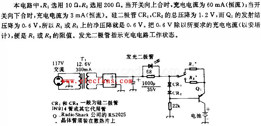 本電路是專為5號(hào)、7號(hào)鎘鎳電池充電而設(shè)計(jì)的,具有自動(dòng)充電、恒流充電的特點(diǎn)。電路如圖所示。接