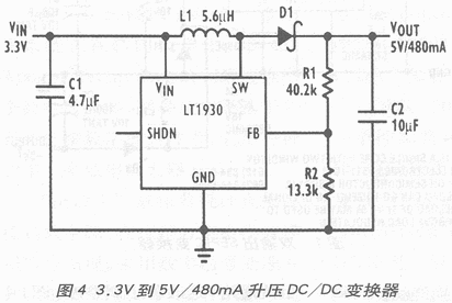 3.3V到5v/480maT升壓DCDC變換器電路    LTC1872這一款電流模式升壓DC/DC控制,其工作頻率550KHz、輸入電壓范圍2.5V~9.8V、負(fù)載電流高達(dá)2A。圖2 為3.3V