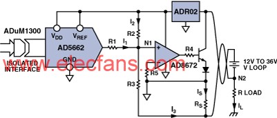 AD5662的最大輸出電壓范圍是5 V,AD5662由ADR025提供基準(zhǔn)電壓,ADR02由可變環(huán)路電壓提供穩(wěn)壓電源。使用一只運(yùn)算放大器和晶體管電路可將該DAC的5 V輸出范圍轉(zhuǎn)換為4 mA~20 mA電流輸出。