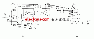 圖(b)所示為高精度恒流電路的應(yīng)用實例,它是將這種恒流電路與開關(guān)電路組合成高精度脈沖發(fā)生電路。VD2和V D3構(gòu)成電平移動電路,VD1和VD4是采用肖特基二極管構(gòu)成的開關(guān)電路。多個這種電路的組合可構(gòu)成高精度D/A轉(zhuǎn)換器。