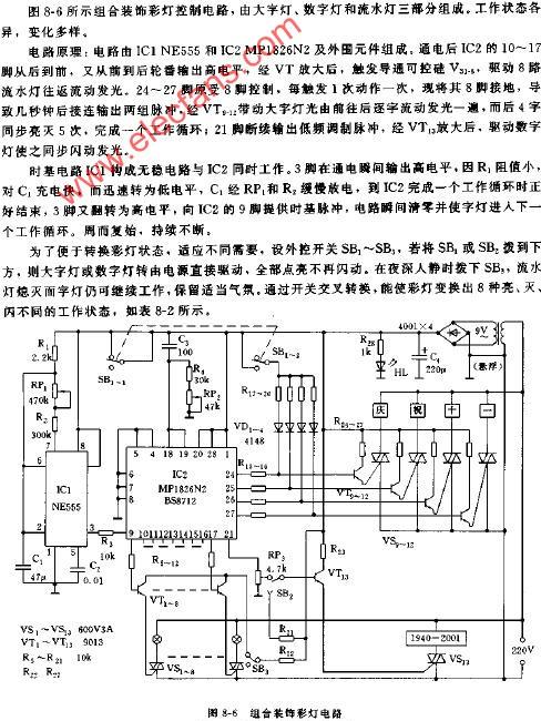 裝飾彩燈控制電路圖,本控制電路以集聲光驅動電路MP1826為核心組成。具有功能多,元件少,費用低,彩燈狀態(tài)各異,變化多樣,絢麗多彩等優(yōu)點。