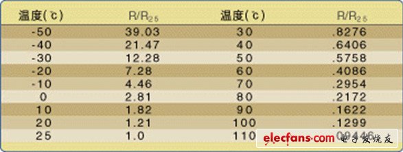 用來測量溫度的傳感器種類很多,熱敏電阻器就是其中之一。許多熱敏電阻具有負(fù)溫度系數(shù)(NTC),也就是說溫度下降時(shí)它的電阻值會升高。在所有被動(dòng)式溫度傳感器中,熱敏電阻的靈敏度(即溫度每變化一度時(shí)電阻的變化)最高,但熱敏電阻的電阻/溫度曲線是非線性的。 圖1是一個(gè)典型的NTC熱敏電阻器性能參數(shù)。