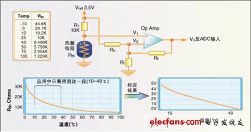應(yīng)注意拉升電阻的阻值必須進(jìn)行計(jì)算,以限定整個(gè)測量溫度范圍內(nèi)的自熱功耗。給定出電阻值以后,由于熱敏電阻阻值變化,耗散功率在不同溫度下也有所不同?! ?br /> 有時(shí)需要對熱敏電阻的輸入進(jìn)行標(biāo)定以便得到合適的溫度分辨率,圖3是一個(gè)將10~40℃溫度范圍擴(kuò)展到ADC整個(gè)0~5V輸入?yún)^(qū)間的電路。