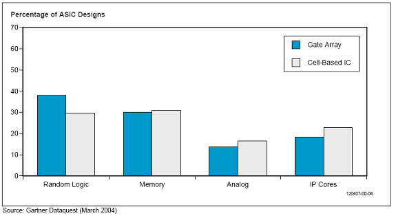 圖四比較了門陣列和基于單元的IC設(shè)計的核心組件。門陣列設(shè)計一般有更多的邏輯線路,而基于單元的IC有更多的模擬器件和嵌入式IP核。