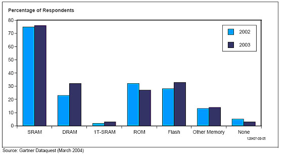 東芝、NEC和三星也開始看好嵌入式DRAM ASIC。現(xiàn)在正是嵌入式DRAM ASIC被市場認(rèn)可的恰當(dāng)時機。這種市場接受度的增強是建立在1T-SRAM的損失上。圖五顯示了根據(jù)調(diào)查回應(yīng)者的投票得出的在基于單元的IC設(shè)計方面對嵌入式DRAM的需求情況。根據(jù)調(diào)查回應(yīng)者的信息,嵌入式閃存將有穩(wěn)定的需求增長,但是如圖五所示,由于SIP的出現(xiàn)這種需求并沒有實現(xiàn)。很多系統(tǒng)設(shè)計者發(fā)現(xiàn),使用SIP,把通用閃存安裝到ASIC上的方式要便宜得多。