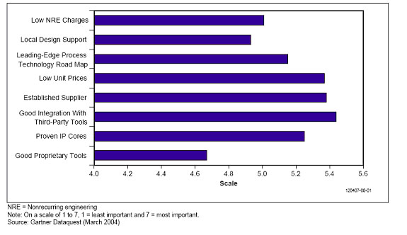 考慮到有眾多的變量和供應(yīng)商,在目前的市場上選擇一家ASIC供應(yīng)商需要很好的技巧。為對系統(tǒng)設(shè)計者們?nèi)绾芜x擇ASIC供應(yīng)商的問題有一個更好的了解,Gartner Dataquest公司讓他們對選擇ASIC供應(yīng)商時考慮的各個因素進(jìn)行重要性分級。圖一顯示了調(diào)查的結(jié)果,圖中1表示最不重要,7表示最重要。