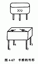 1.全橋 全橋是由4只整流二極管按橋式全波整流電路的形式連接并封裝為一體構(gòu)成的,圖4-65是其電路圖形符號(hào)與內(nèi)部電路,圖4-66是其外形。