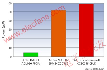 在所有這些功耗方式下,Actel IGLOO系列 FPGA的功耗都顯著減小,因而能優(yōu)化系統(tǒng)中可編程邏輯部分的功耗。
