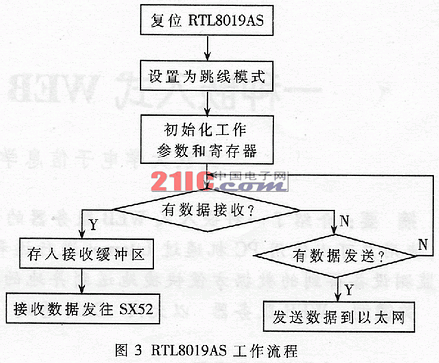 要實現(xiàn)嵌入式WEB服務器接入以太網(wǎng),就要對RTL8019AS進行編程,完成以太網(wǎng)幀的數(shù)據(jù)收發(fā),相當于實現(xiàn)PC機中網(wǎng)卡的驅(qū)動程序功能。首先要對RTL8019AS進行復位,并將其設置為跳線模式;然后對RTL8019AS的工作參數(shù)進行設置,以使其開始工作;接下來讀寫RTL8019AS的RAM以完成數(shù)據(jù)包的接收和發(fā)送。程序流程如圖3所示。