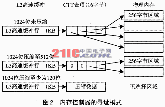 壓縮內(nèi)存控制器必須根據(jù)長度格式的不同將系統(tǒng)總線上的實際地址翻譯成物理內(nèi)存的中的物理地址。實際地址是出現(xiàn)在處理器外部總線上常規(guī)地址。篁 址用來錄十壓縮內(nèi)存的256字節(jié)區(qū)域。實際地址空間存在于L1/L2/L3高速緩沖中,用于立即訪問。而其余的內(nèi)存內(nèi)容部分以壓縮形式存在于物理內(nèi)存中。內(nèi)存控制器通過查詢壓縮翻譯表(CTT)執(zhí)行從實際地址到物理地址的翻譯,這個表被保留在物理內(nèi)存的某個位置。圖2是CTT表的格式及內(nèi)存控制器的尋址模式。