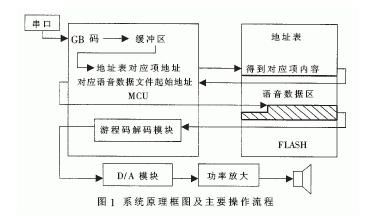 圖1為系統(tǒng)原理圖框圖以及主要操作流程。系統(tǒng)采用串行口與外界交互,任何具有標準串口的設(shè)備均可與本系統(tǒng)相連。欲發(fā)音漢字的國標碼(GB碼)由串口送入MCU,MCU將其映射為Flash存儲器地址表中對應(yīng)項的地址,然后根據(jù)此地址取得對應(yīng)項中的命令字,由MCU根據(jù)該命令字讀取該漢字發(fā)音對應(yīng)的語音數(shù)據(jù),連續(xù)讀出語音數(shù)據(jù)并以游程碼解碼算法解碼后,按照語音采樣時的固定速率通過D/A轉(zhuǎn)換和功率放大播放。本文中語音采樣速率為11025B/s。為滿足應(yīng)用需求,本文首先構(gòu)建易于快速解碼的語音庫,根據(jù)特定Flash存儲器的存儲格式,以快速多查找表尋址及命令字預(yù)先存儲的方式組織并存儲在Flash存儲器中,以滿足語音播放的實時要求。同樣,MCU的代碼也要優(yōu)先考慮速度而犧牲諸如模塊化、可讀性方面的要求。最后,出于實用性考慮,系統(tǒng)中需加入足夠的輸入緩沖區(qū)支持,以滿足一次輸入多個流字或整句的要求。