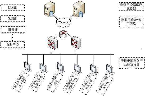 研祥系列加固平板電腦,已經(jīng)在雙匯集團的多個車間和產品線部署,已經(jīng)是雙匯集團信息化管理的得力助手。在各條生產線可以看到平板電腦相當于一個操作終端,觸摸屏方便操作,一線工作人員輸入的產品線數(shù)據(jù)通過VPN專用網(wǎng)絡入庫,數(shù)據(jù)集中存儲在數(shù)據(jù)中心機房的數(shù)據(jù)庫服務器,各個終端都有各自對應的應用平臺,可以實現(xiàn)查詢、統(tǒng)計、監(jiān)控、輸入作業(yè)話單等功能。其他部門如信息部、采購部、財務部等,可以通過PC進行相應業(yè)務的統(tǒng)計、查詢、產品管理等操作,實現(xiàn)了全公司的信息化管理,提高生產效率。