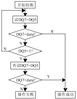 Flash內(nèi)部的編程或擦除算法可自動(dòng)完成編程或擦除操作,但我們必須了解其內(nèi)部的操作檢測(cè)機(jī)制,以便知道操作是否完成或正確。常用檢測(cè)的狀態(tài)位有:跳變位(DQ6)、超時(shí)標(biāo)志位(DQ5)、數(shù)據(jù)查詢位(DQ7)和Ready/Busy引腳(RY/)。檢測(cè)的方法有三種。第一種是判斷引腳RY/的狀態(tài),在編程、擦除或擦除掛起操作過(guò)程中,RY/引腳一直為“0”,操作完成后變?yōu)椤?”。 第二種是檢測(cè)跳變位DQ6,在編程或擦除時(shí)對(duì)任何地址進(jìn)行連續(xù)的讀均引起DQ6連續(xù)跳變,直至操作結(jié)束才停止跳變。最后一種是使用數(shù)據(jù)線的DQ7、DQ5:DQ7位在編程或擦除過(guò)程中輸出的數(shù)是寫入該位數(shù)據(jù)的反碼,當(dāng)操作完成時(shí)輸出才變?yōu)閷懭朐撐坏臄?shù)據(jù);DQ5的狀態(tài)為“1”時(shí)表示操作超時(shí),此時(shí)應(yīng)再讀一次DQ7的狀態(tài),若DQ7輸出仍不是寫入的數(shù)據(jù),則操作失敗,復(fù)位Flash,其流程如圖1所示。