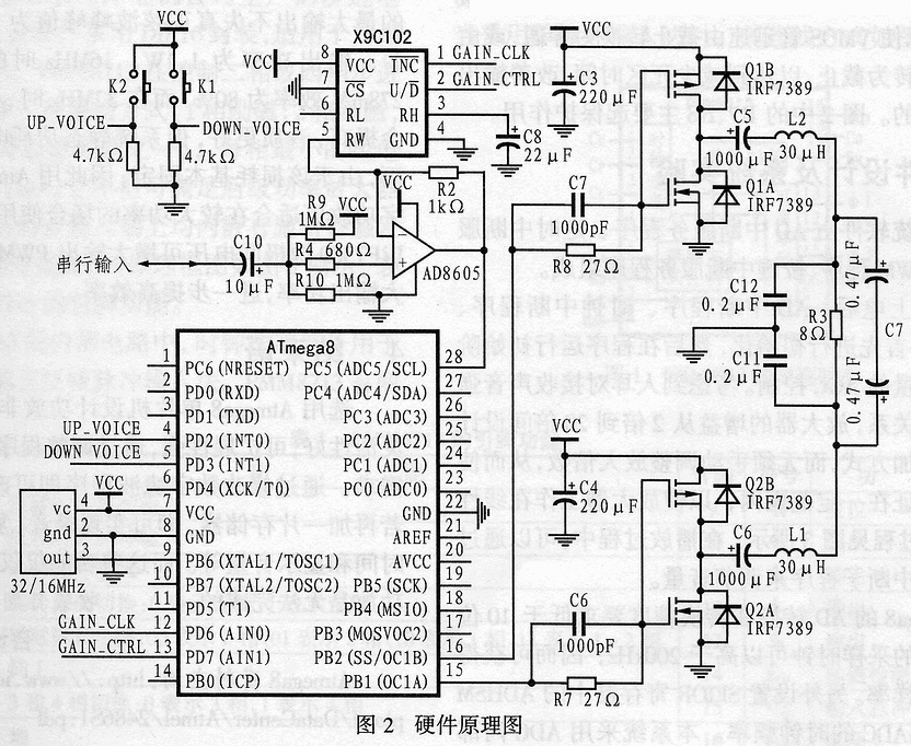 該設(shè)計(jì)的硬件電路分為三部分,包括前置放大、A/D與PWM轉(zhuǎn)換、功率放大及濾波等,其硬件電路原理如圖2所示。本系統(tǒng)的PWM頻率至少要調(diào)制到信號最高頻率(20kHz)的5倍以上,才能保證音頻信號很好的還原。若工作頻率為16MHz,則PWM的計(jì)數(shù)最大值(以下簡稱TOP)將為: fCLK-I/O/fpwm=16MHz/100kHz=160。此外,A/D的采樣值(最大255)也必須除以一定的數(shù)值才能作為PWM輸出比較寄存器(以下簡稱OCR1A/OCR1B)的值,這顯然會(huì)降低AD的等效精度。而要保證AD原有的精度和PWM頻率,則應(yīng)提高晶振。經(jīng)測試:mega8在32MHz下還可正常工作,此時(shí)AD采樣值可直接作為OCR1A/OCR1B值,此時(shí)的PWM頻率為32MHz/255=125.5kHz。