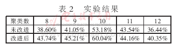 試驗(yàn)中對使用公式(3)和(5)的改進(jìn)k-means算法和原k-means算法的平均準(zhǔn)確度進(jìn)行了比較,實(shí)驗(yàn)結(jié)果如表2所示。