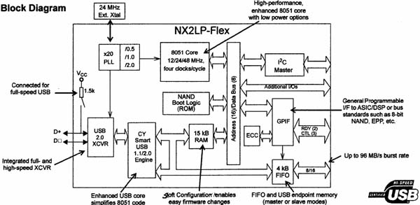 當(dāng)前,市場(chǎng)供應(yīng)許多種USB協(xié)議的接口芯片,不帶微控制器內(nèi)核的有Philips公司的PDIUSBD12系列、NS公司的USBN9602系列等;帶微控制器內(nèi)核的有Cypress公司的EZ- USB系列、Atmel公司的AT83C5134系列等。智能USB接口芯片將微控制器內(nèi)核、USB接口引擎、USB收發(fā)模塊、存儲(chǔ)器、閃存或FPGA、串行口等功能集成在一起,從而減少芯片接口時(shí)序,減小引腳數(shù)和占用面積,是 USB接口芯片的發(fā)展方向。一種智能 USB接口芯片的方框圖如圖2所示。此外,還有 USB設(shè)備組網(wǎng)使用的集線器芯片、USB路由器芯片可供使用。