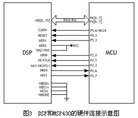 ????? 圖3是MSP430和DSP之間的硬件連接示意圖[3]。如圖所示,這種連接方式將DSP和MCU配置成了16位復(fù)用連接模式(HMODE=0),數(shù)據(jù)和地址共享HD總線。HRW、HCNTL0和HCNTL1的不同組合分別表示對DSP的EHPI口的三個寄存器HPID(數(shù)據(jù))、HPIA(地址)、HPIC(控制)讀寫,具體的組合方式如表2所示。