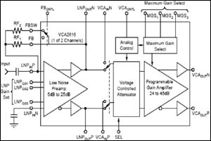 VCA2611/6 包含兩個低噪聲前置放大器 (LNP) 以及低噪聲可變增益放大器 (VGA)。VCA2611 是 VCA2616 的升級版本,其輸入處可處理 -2.0V 負向輸入峰值,在低噪聲前置放大器之前實現(xiàn)較慢的廉價輸入鉗位二極管 (VCA2616 只能處理 -0.3V 的峰值)。在某些設(shè)計中,我們甚至不需要輸入鉗位。