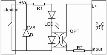 開關(guān)量的光電隔離接口電路采用普通的光耦元件實現(xiàn),如圖2所示。其中LED用于指示設(shè)備的工作狀態(tài),TVS為瞬變電壓抑制器,選用了單向TVS二極管P6KE30A,其阻斷電壓為28.5V,工作電壓為25.6V,脈沖峰值電流14.7A,典型的響應(yīng)時間小于1ps。當(dāng)其雪崩擊穿時,動態(tài)電阻小,響應(yīng)速度快(理論上高達10-12s),器件面積大,可吸收大的浪涌電流?,F(xiàn)場使用的結(jié)果表明:將該器件放在接口電路板的輸入/輸出端附近,能有效地減小高壓打火對集成電路芯片的損壞。如果再配以適當(dāng)?shù)腞C電路,其效果會更明顯,且還具有一定的濾波作用。