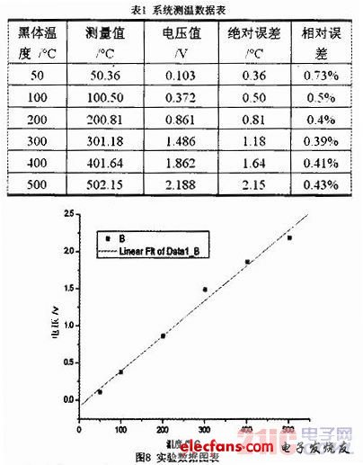 考慮到系統(tǒng)的測(cè)溫范圍在500℃以下及其它因素,實(shí)驗(yàn)采用干體爐作為熱源,該熱源最高可達(dá)850℃左右,環(huán)境溫度選為18℃,即291.15K。假定發(fā)射率為0.97。表1為系統(tǒng)測(cè)溫?cái)?shù)據(jù)。圖8為實(shí)驗(yàn)數(shù)據(jù)圖表,數(shù)據(jù)源來(lái)自表1。
