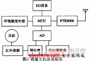 典型的紅外測(cè)溫系統(tǒng)由被測(cè)對(duì)象、紅外測(cè)溫主機(jī)、發(fā)射傳輸裝置及接收裝置組成。本文采用測(cè)量主機(jī)與無(wú)線通信從機(jī)的雙機(jī)模式實(shí)現(xiàn)。圖3為測(cè)量主機(jī)原理框圖,測(cè)量主機(jī)完成紅外溫度數(shù)據(jù)的采集處理,由紅外探測(cè)系統(tǒng)和單片機(jī)MSP430F149組成。采用多路AD芯片(MSP430內(nèi)部AD)實(shí)現(xiàn)模擬量到數(shù)字量的轉(zhuǎn)換,并且留有其它模擬量的測(cè)量通道,可擴(kuò)展諸如濕度等其他模擬量的監(jiān)控。為了補(bǔ)償環(huán)境溫度可連接環(huán)境溫度傳感器DS18B20。采用無(wú)線收發(fā)模塊PTR8000實(shí)現(xiàn)數(shù)據(jù)的無(wú)線傳輸,PTR80005特有內(nèi)置環(huán)形天線,可直接與單片機(jī)連接,無(wú)須外接其他器件,實(shí)現(xiàn)數(shù)據(jù)的無(wú)線收發(fā)。