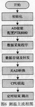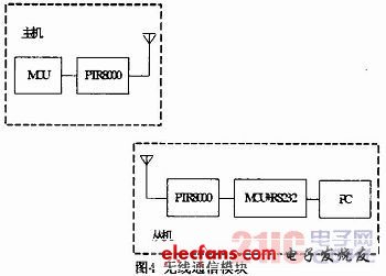 該系統(tǒng)中主機(jī)的任務(wù)是完成數(shù)據(jù)采集與處理,包括進(jìn)行A/D轉(zhuǎn)換、環(huán)境溫度補(bǔ)償,對(duì)即將傳送來(lái)的數(shù)字信號(hào)進(jìn)行組織處理。發(fā)射端的PTR 8000將單片機(jī)的信息調(diào)制成射頻信號(hào)發(fā)出,接收端的PTR8000模塊將接收到的信息解調(diào)成為T(mén)TL電平,由單片機(jī)處理后經(jīng)由RS232接口送到PC,供計(jì)算機(jī)后期處理。