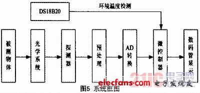 光學(xué)系統(tǒng)匯聚其視場(chǎng)內(nèi)的目標(biāo)紅外輻射能量,視場(chǎng)的大小由測(cè)溫儀的光學(xué)零件及其位置確定。紅外能量聚焦在光電探測(cè)器上并轉(zhuǎn)變?yōu)橄鄳?yīng)的電信號(hào)。由于該電信號(hào)十分微弱,因此要經(jīng)過(guò)放大處理后再送入信號(hào)處理電路,同時(shí)為了消除環(huán)境溫度的影響,增加了補(bǔ)償電路,然后經(jīng)儀器內(nèi)部的算法和目標(biāo)發(fā)射率校正后換算為被測(cè)對(duì)象的溫度值,最終通過(guò)傳輸線路顯示到輸出終端。