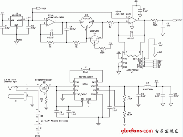 電路是使用電化學傳感器的單電源、低功耗、電池供電、便攜式氣體探測器。本示例中使用Alphasense CO-AX一氧化碳傳感器。對于檢測或測量多種有毒氣體濃度的儀器,電化學傳感器能夠提供多項優(yōu)勢