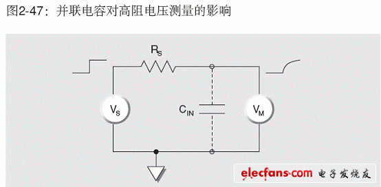 的狀態(tài)。輸入電容對上升時間和噪聲的影響 電壓測量 在對高阻抗源進行電壓測量時(圖2-47),電壓表(VM)兩端的電容(CIN)必須通過RS充電。輸出電壓對時間的函數(shù)關(guān)系為: VM = VS (1-e-t