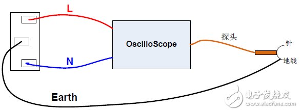 針對(duì)方案二,模擬探頭標(biāo)明的電阻,電容分布參數(shù),又進(jìn)行了一些試驗(yàn):例如負(fù)端飛線,通過串聯(lián)電阻,電容等方式接地,均無法匹配探頭底線接觸的現(xiàn)象。后來仔細(xì)分析發(fā)現(xiàn),我的單板供電直流穩(wěn)壓電源的輸出電壓的地線與市電電力線未共地(圖4),即圖中虛線未連接。此時(shí),用萬用表測(cè)試示波器探頭的地線與直流源 (-端)輸出的GND 之間,發(fā)現(xiàn)有個(gè)很小的電壓壓差。